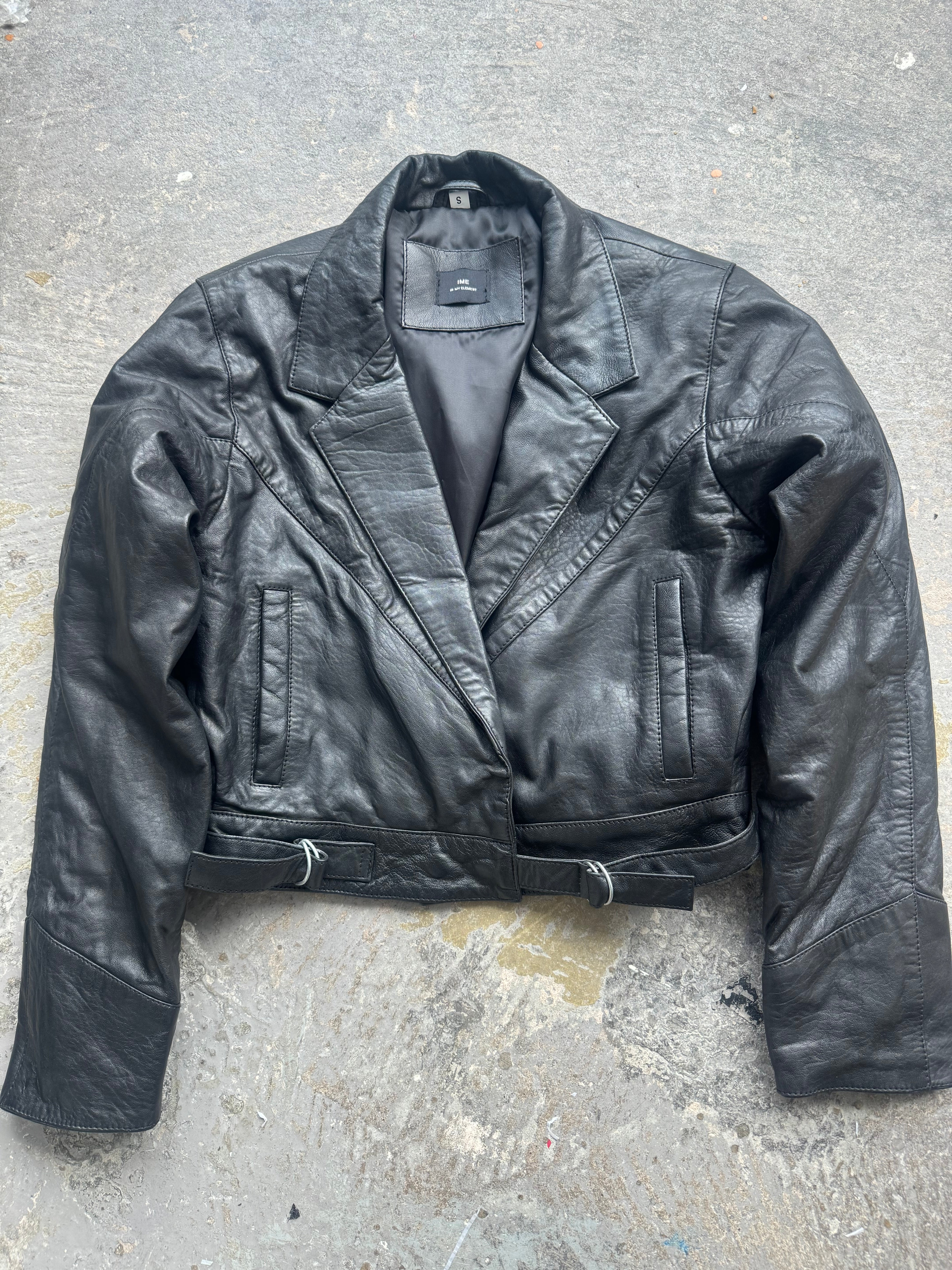 This cropped jacket was developed during our sampling phase, drawing inspiration from vintage leather silhouettes. Crafted from supple black sheepskin leather, it features a sharp tailored collar, cropped hemline, and side buckle adjusters for a custom fit. This design was part of our exploration of retro-inspired proportions and didn’t make the final production line — making it a rare one-off.