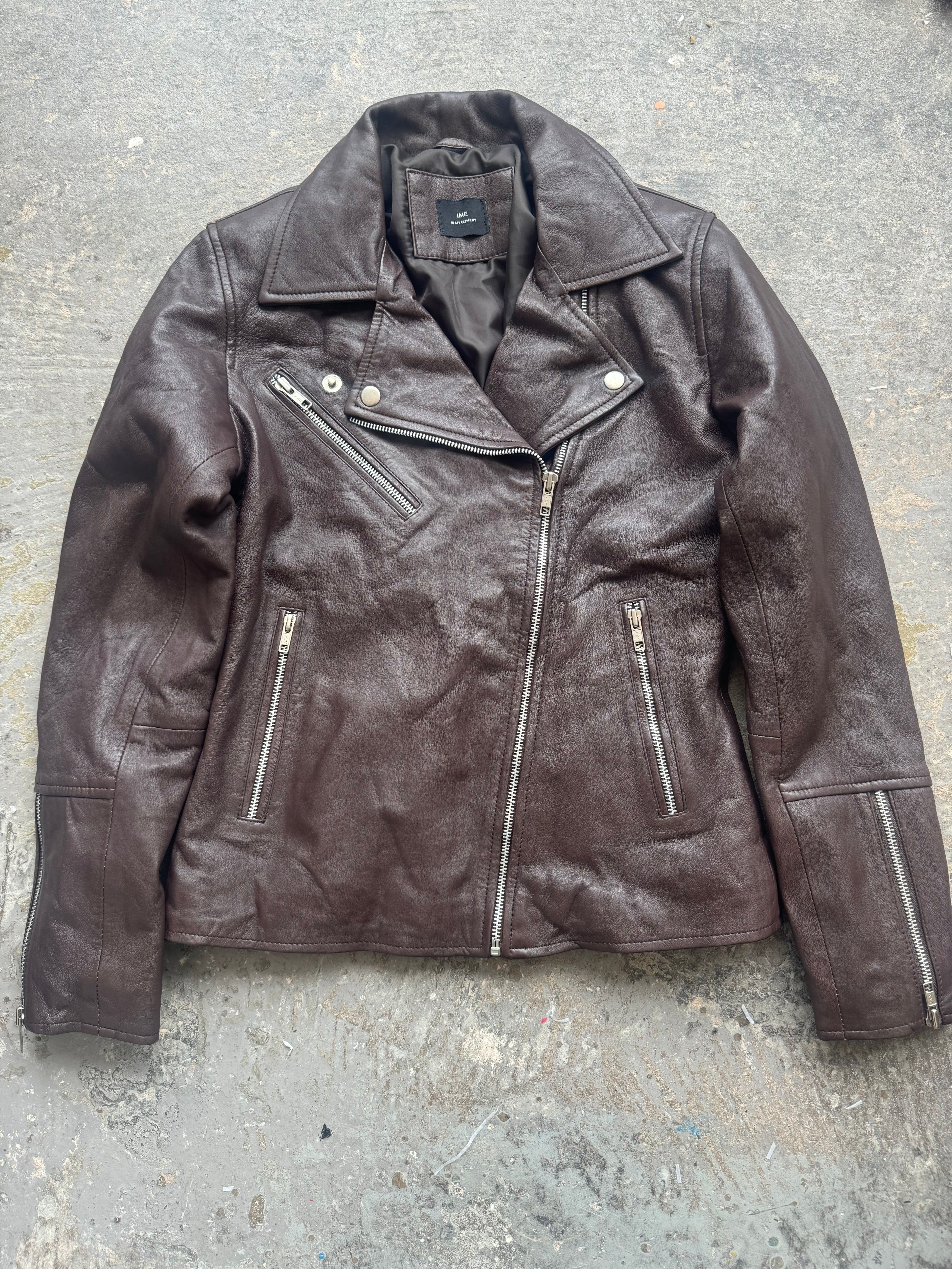 This dark brown biker-inspired jacket was developed as part of our sampling process, crafted from supple sheepskin leather. Featuring an asymmetric zip front, wide lapels, and multiple zip pockets, it blends classic biker edge with a refined, minimalist finish. This design was tested during development but did not make the final cut, making this a unique one-off sample.