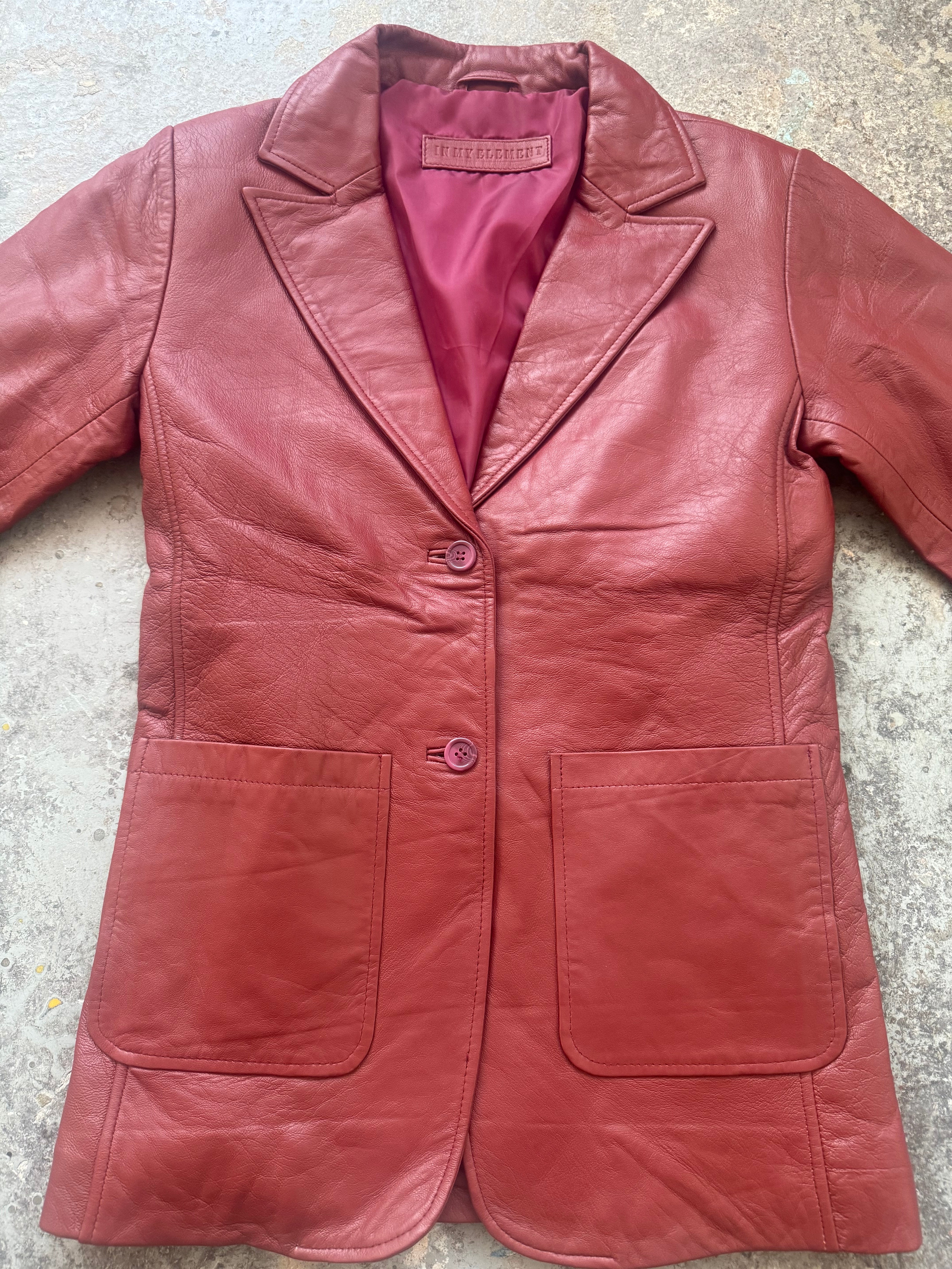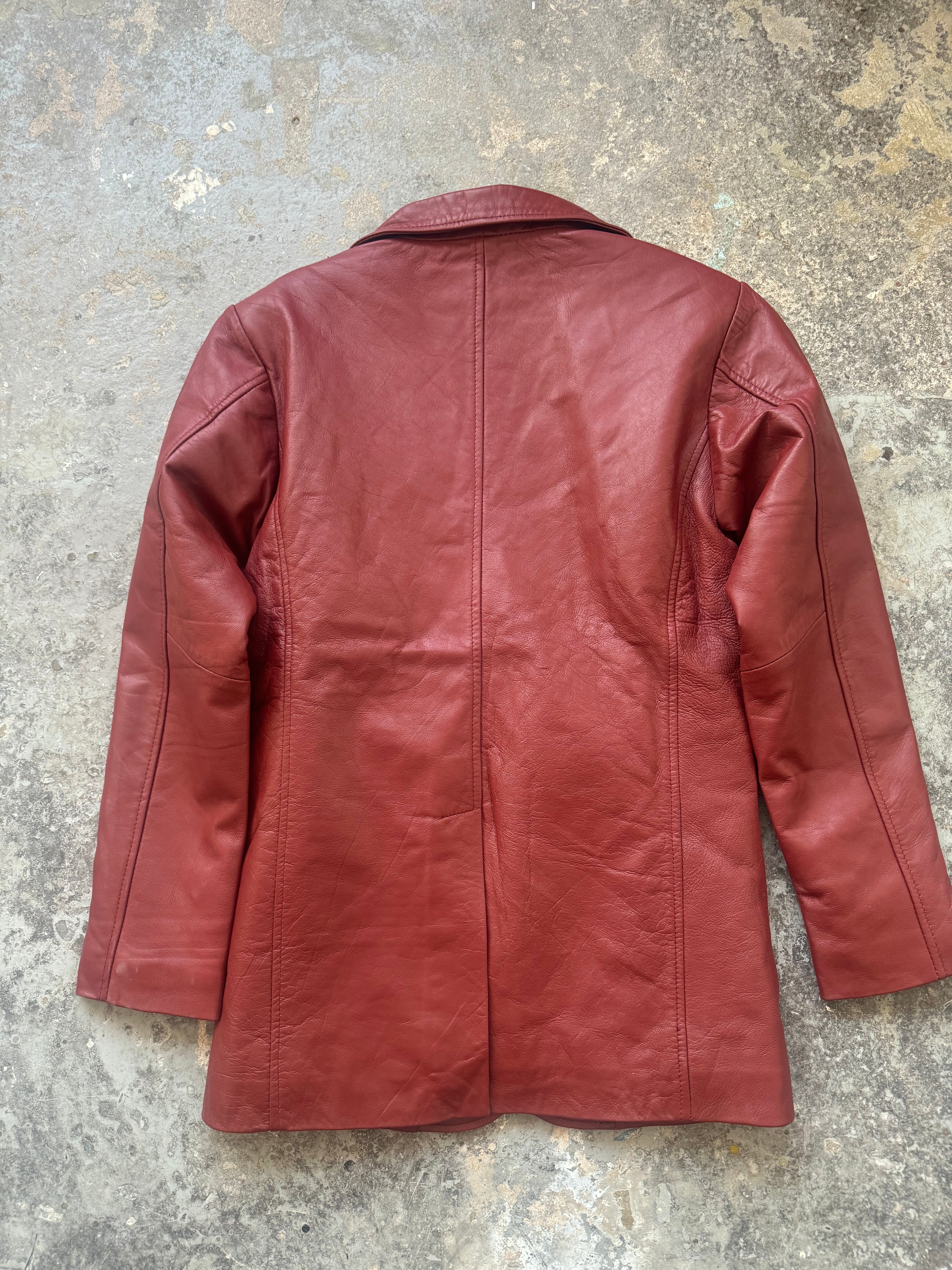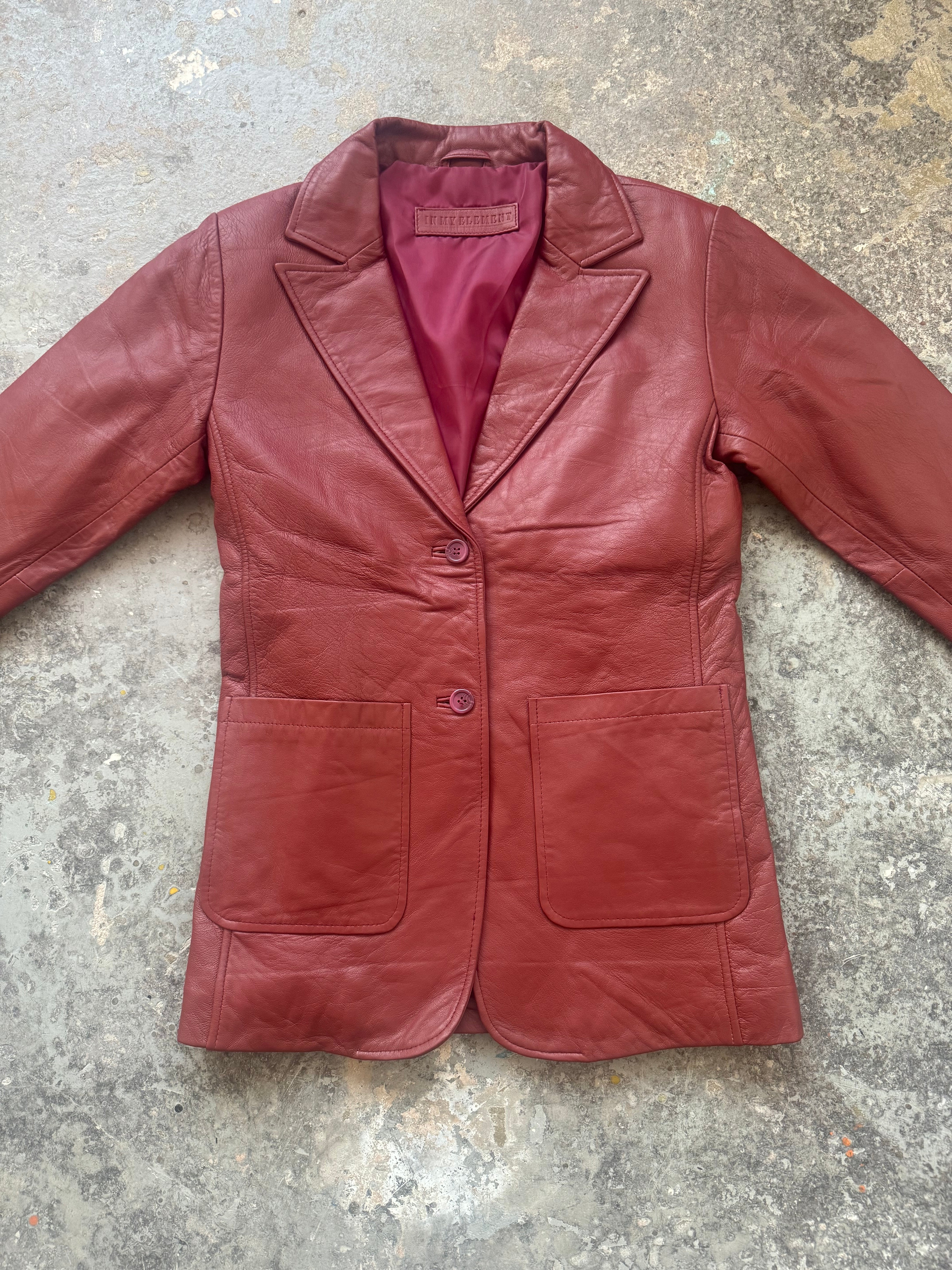 This leather blazer was crafted as part of our sampling process, designed in a deep red sheepskin leather finish. Featuring a tailored silhouette with notch lapels, button-front closure, and oversized patch pockets, it offers a sleek yet casual look. During sampling, we ultimately opted for a burgundy leather shade for production — leaving this piece as a unique one-off sample.