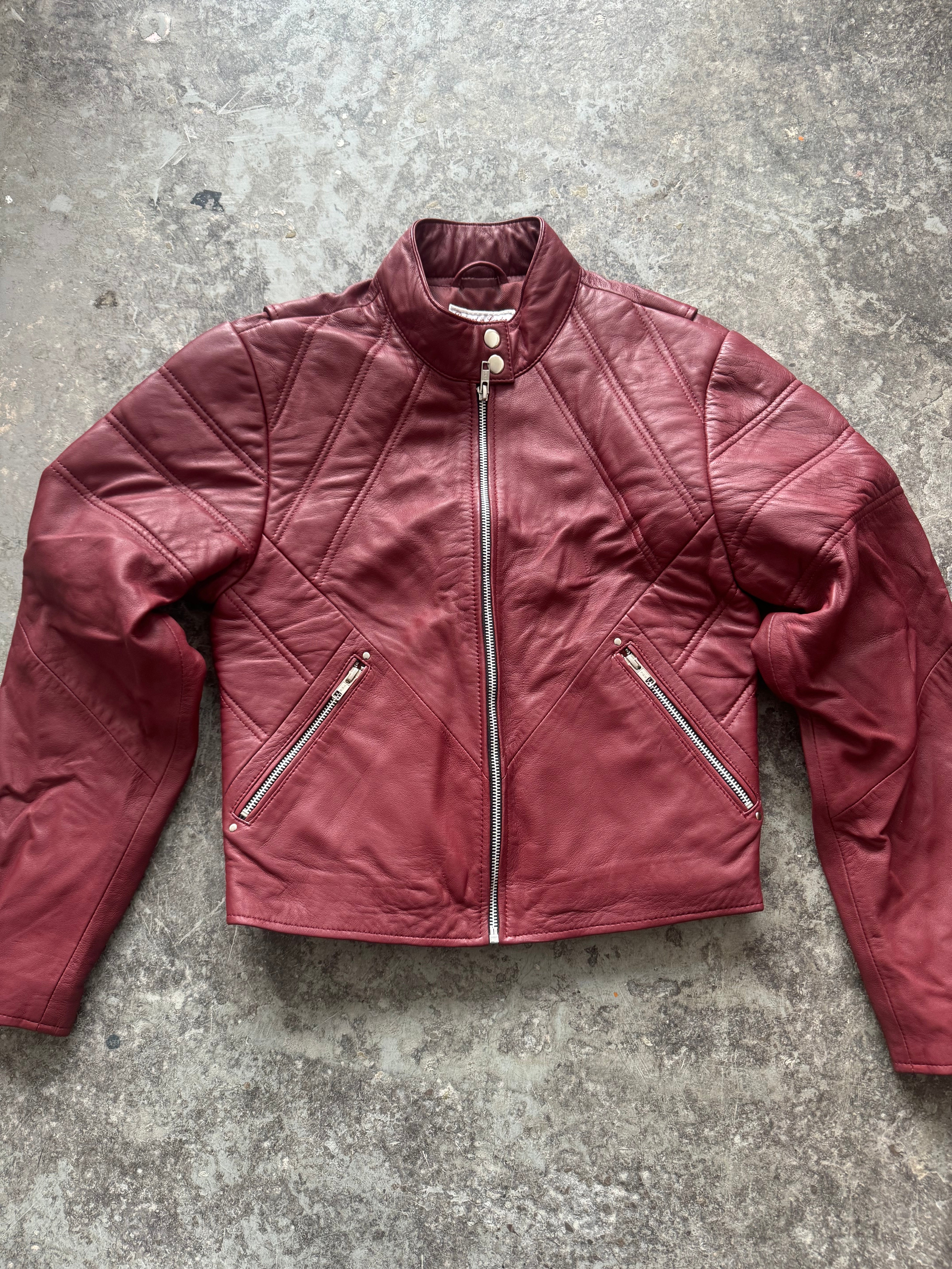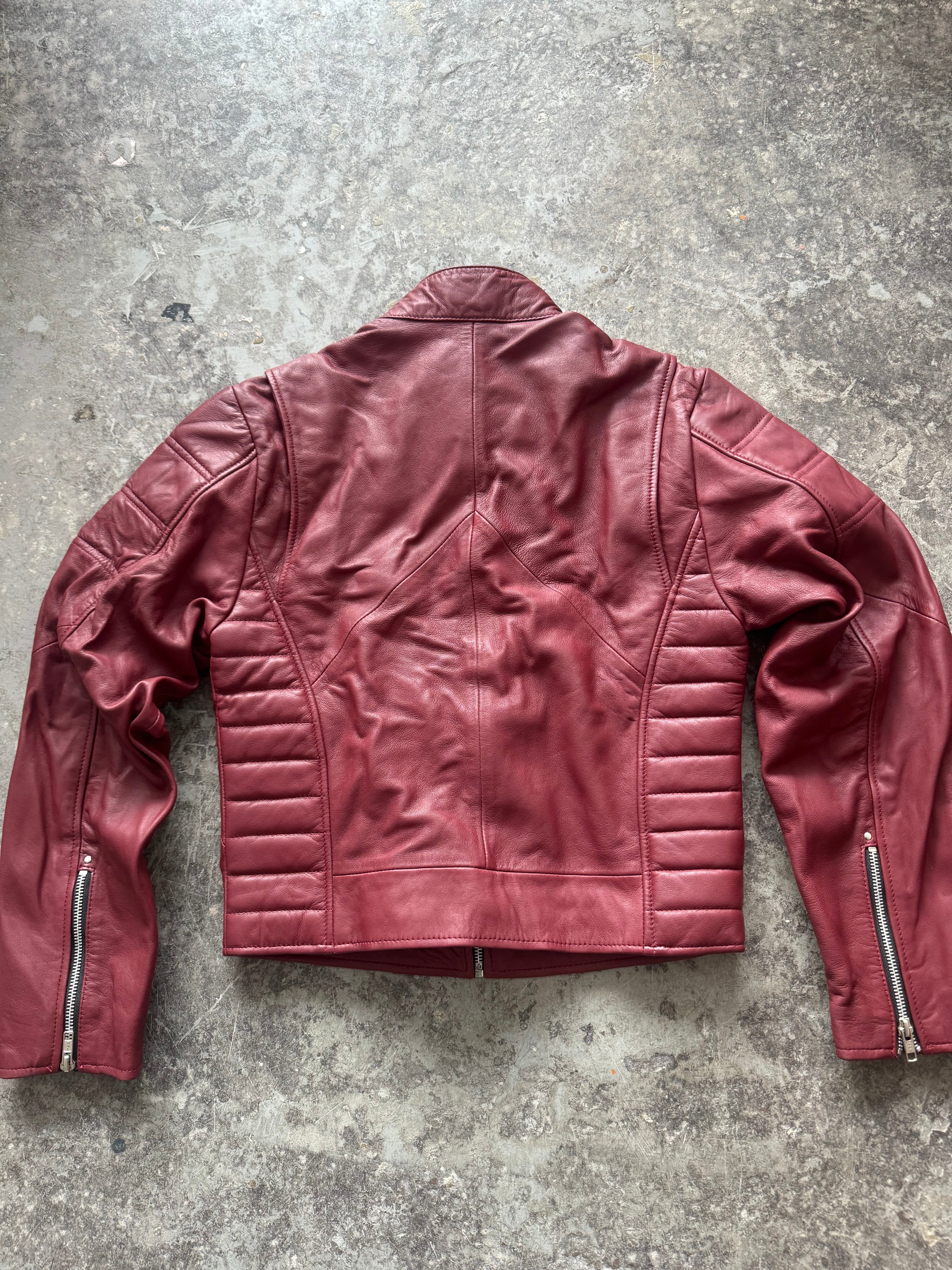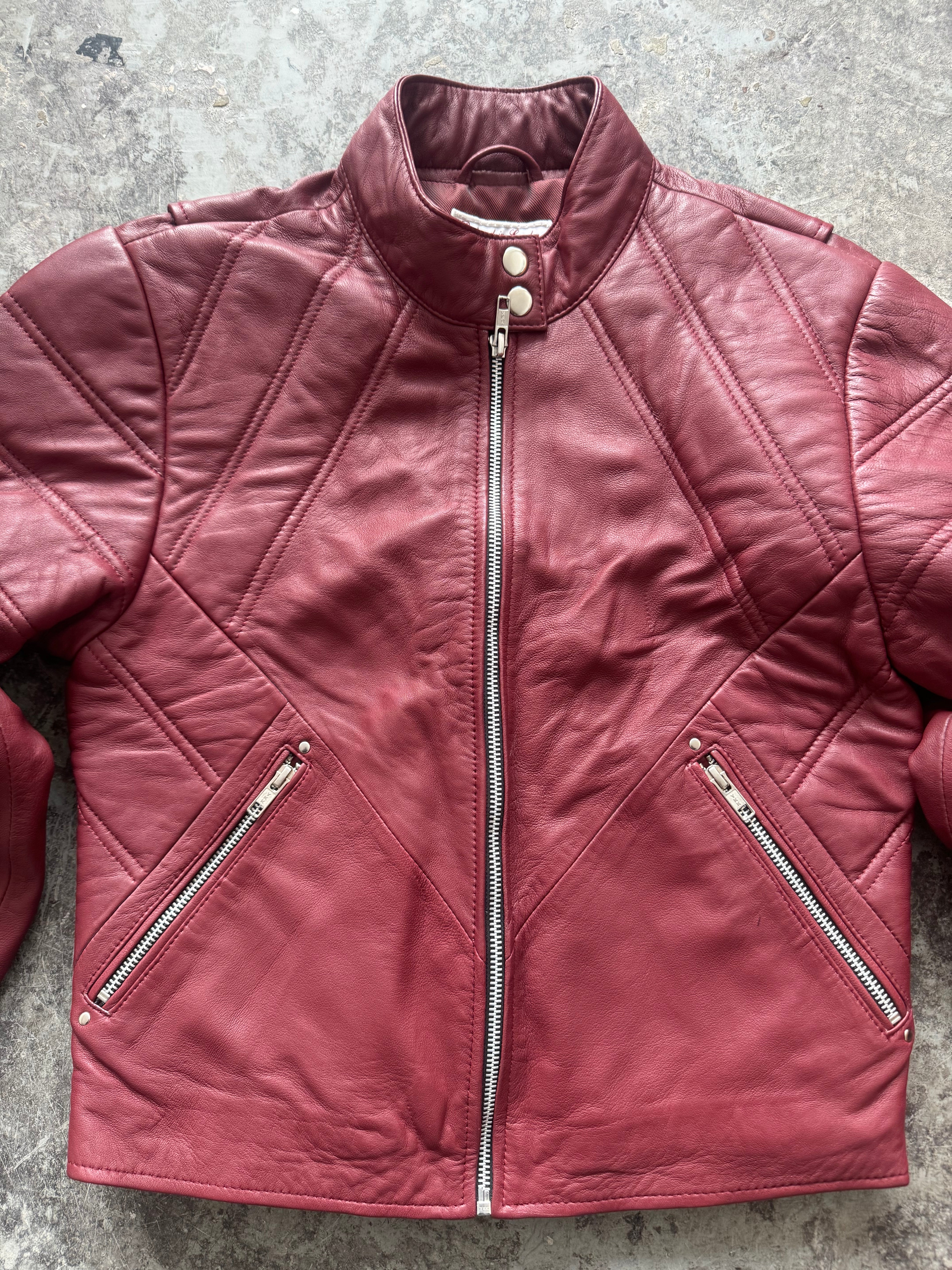 Crafted from buttery-soft sheepskin leather, this deep red moto racer jacket features bold panel quilting and structured seam detailing for a flattering silhouette. Finished with a high snap collar, zipped cuffs, and angled zip pockets, it’s a standout piece that blends timeless biker styling with a rich colour pop.