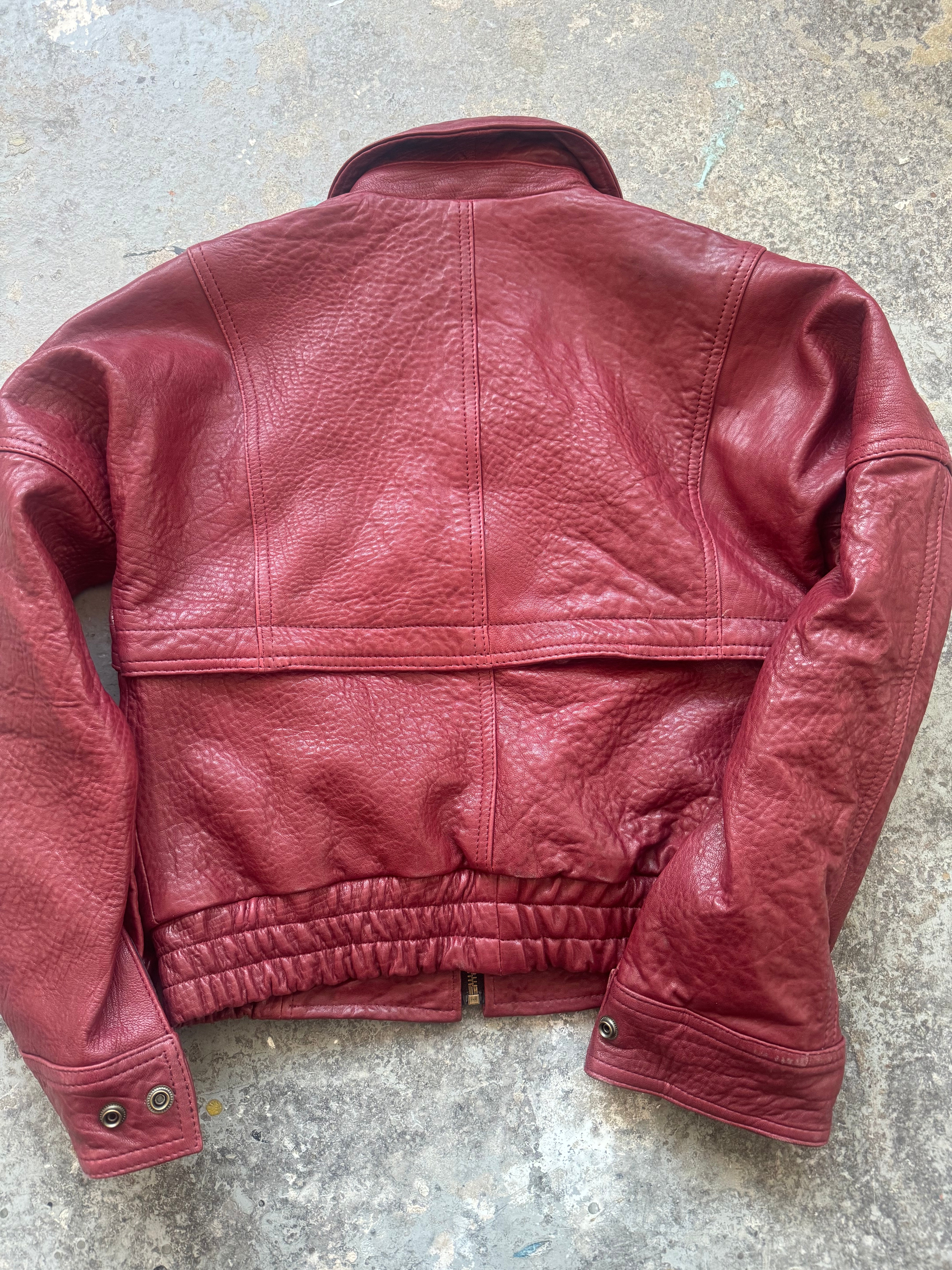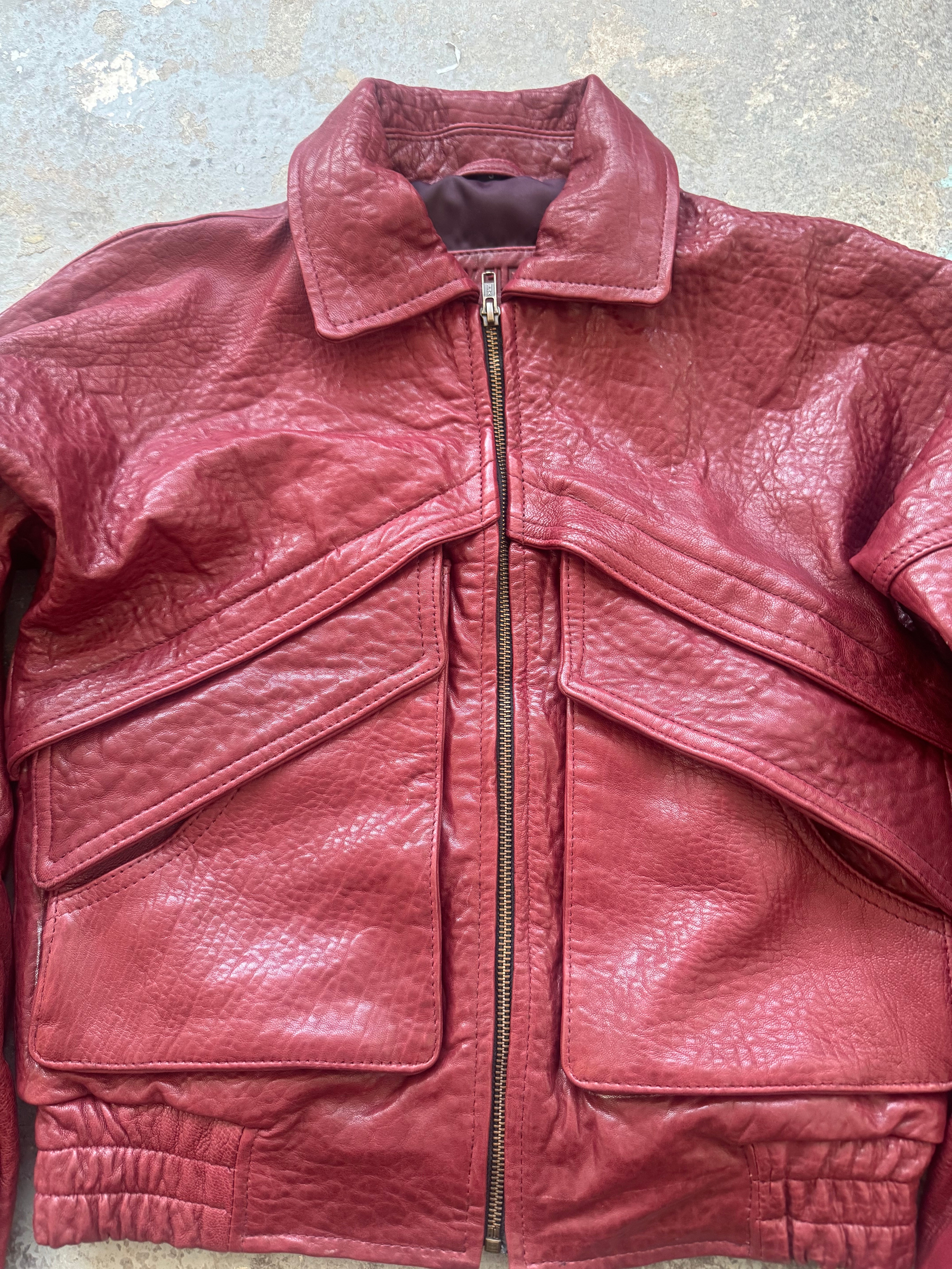 This deep red leather jacket was developed as part of our sampling process, designed to explore textured leather finishes and oversized pocket detailing. Crafted from soft yet structured sheepskin leather, it features a boxy silhouette, exaggerated front flap pockets, and elasticated back hem for shape. This piece didn’t make the final collection, but it’s a bold, standout sample in its own right.