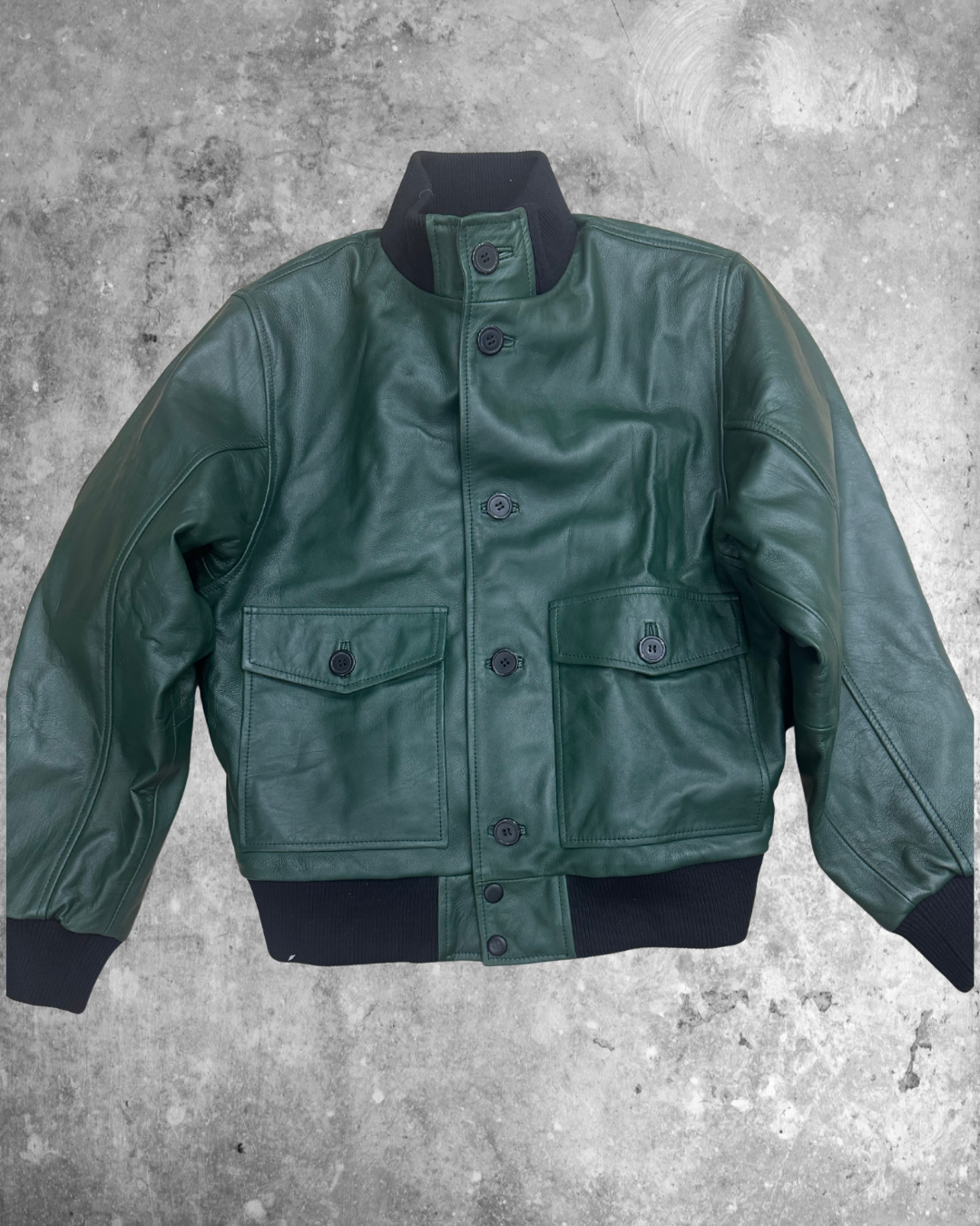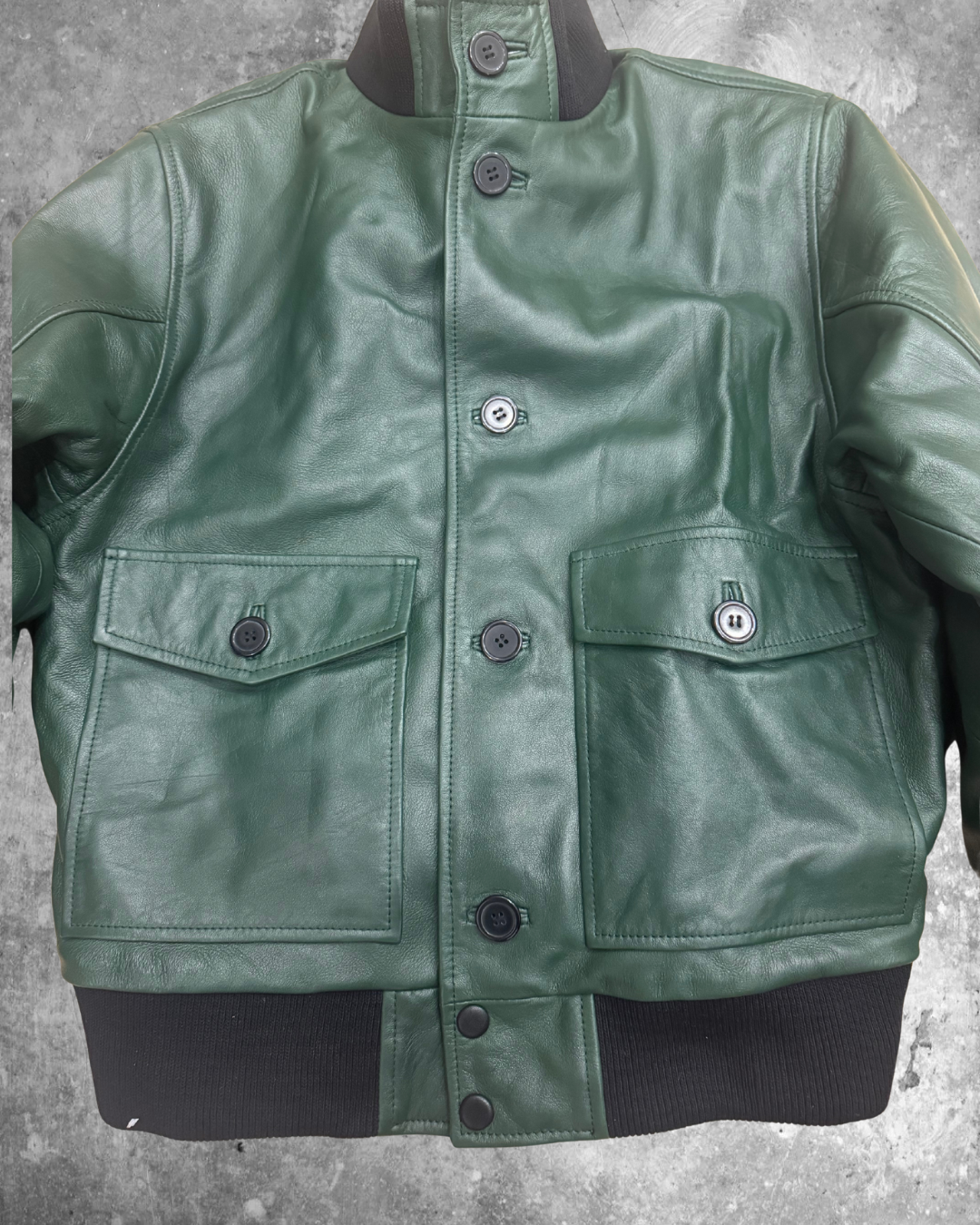 This funnel neck jacket was developed as part of our leather outerwear sampling process. Crafted from soft lambskin leather in a rich emerald green finish, the piece features a structured funnel neck, ribbed trims, and a clean, utilitarian silhouette with subtle military influence. Designed to explore proportion, leather weight, and detailing, this jacket never made the final production cut but stands strong as a premium standalone piece.
