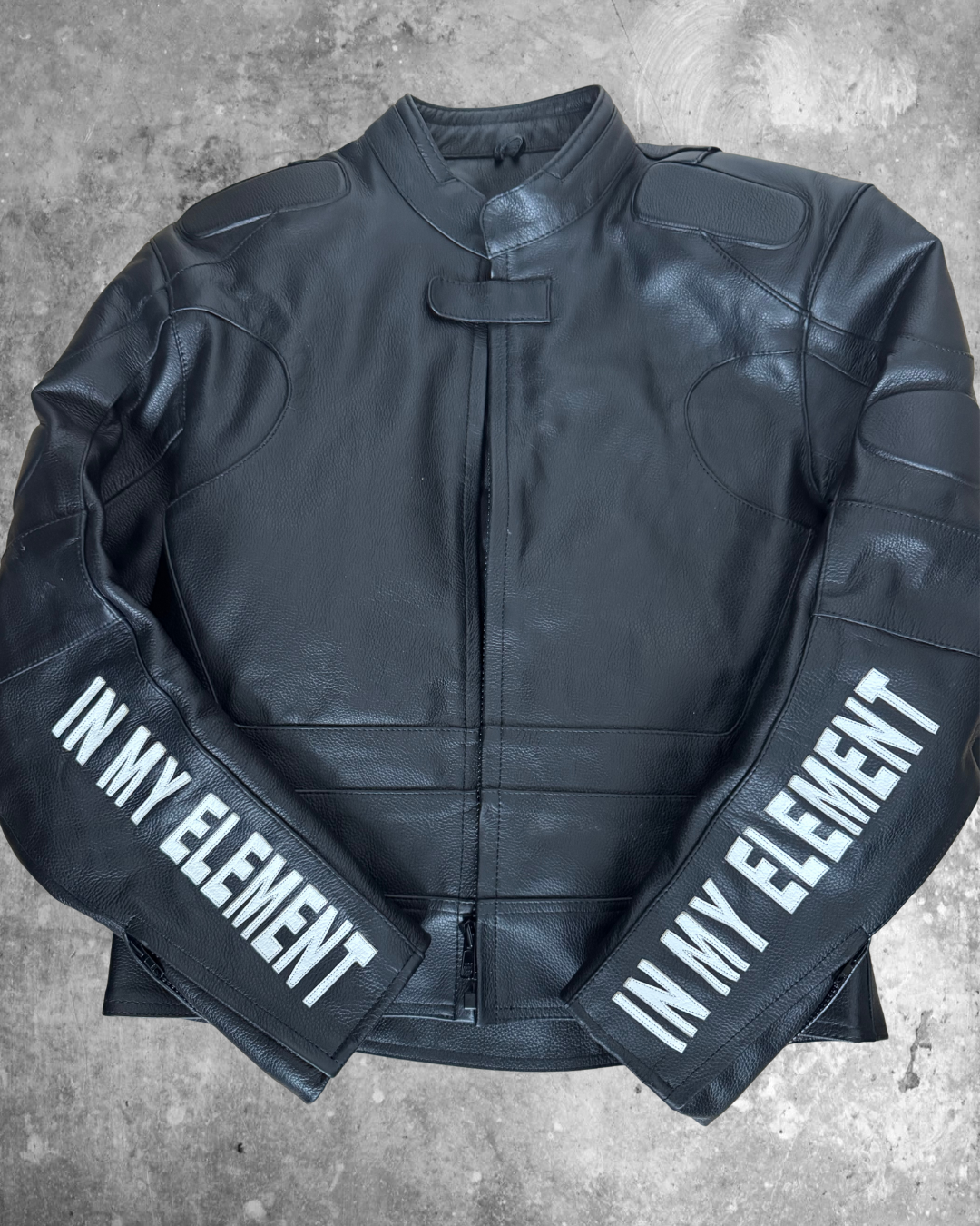 This branded moto racer jacket was developed as part of our performance-inspired leather outerwear sampling. Crafted from durable cowhide leather in a clean black finish, the piece features a streamlined racer silhouette with articulated paneling, reinforced shoulder detailing, and bold In My Element sleeve branding. Designed to explore structure, protection, and brand-led detailing, this jacket never made the final production cut — but remains a strong archive statement blending function with identity.